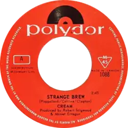 In April 1967, during their first trip to New York, Cream recorded a song called "Lawdy Mama" with Ahmet Ertegun at Atlantic Studios, at the beginning of the sessions for what would become the Disraeli Gears album. The band cut two versions of the song, the first a typical blues shuffle, and the second converted to straight time in a more rock 'n' roll style (both versions can be heard on the Those Were the Days collection). Producer Felix Pappalardi took the tape of the second version of "Lawdy Mama" and, with help from his wife Gail Collins, transformed the song into "Strange Brew" which according to Eric Clapton "created a pop song without completely destroying the original groove."[3][4] One journalist noted that Clapton at this stage was employing Albert King guitar stylings; and that both "Strange Brew" and another Cream track, "Born Under a Bad Sign", "were practically Albert King parodies". Clapton's guitar solo on "Strange Brew" is taken nearly note for note from Albert King's solo on "Oh Pretty Woman" (from King's Born Under a Bad Sign album)[5] Clapton performs lead vocals on the song mostly in falsetto. It was the first Cream single on which he sang lead. Unlike the group's previous single, "I Feel Free", no promotional video was made for the song, but the band mimed to it on television on the German program Beat Club on 19 May 1967.[6] The song later appeared on the soundtrack of the 1979 feature film, More American Graffiti.
