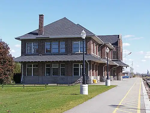 The Ontario Heritage Act designation notes that the station is built in the Prairie Style of architecture, influenced by Frank Lloyd Wright.[4] It was erected by the Grand Trunk in 1913 and opened in August 1914. The designation covers the exterior of the whole structure, roof, masonry, windows, original doors and brick platforms (these were covered at the time of the designation in 1988). The building included a tower, that has since been removed.[5]