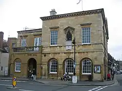 Next along the route is The Corn Market, where four streets converge. Located on the corner of Chapel Street and Sheep Street is the stone built Town Hall, another Grade II* listed building and constructed in 1767. On the front of the building there is a statue of Shakespeare which was given by the Shakespearean actor David Garrick. Opposite the Town Hall is a High Victorian property built in 1883 for the Birmingham Banking Company.[4][5]