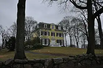 The Strickland Road Historic District of Greenwich, Connecticut is a 9-acre (3.6 ha) historic district that was listed on the U.S. National Register of Historic Places in 1990.[1] The district extends along Strickland Road in the Cos Cob section of Greenwich, between its junction River Road in the south, to just north of its junction with Loughlin Road in the north. It represents a well-preserved cross-section of residential architecture dating coverint a 200-year period, from about 1740 to 1934. It includes the c. 1730 Bush-Holley House, a historic house museum which is a National Historic Landmark for it role in the Cos Cob art colony. There are 28 primary contributing buildings in the district. Most of the buildings are wood-frame structures between one and three stories in height; the notable exceptions are two of the later houses, which are Tudor Revival in style and have brick and stucco exteriors.[2]