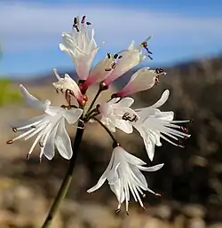 Strumaria hardyana is a species of plant that is endemic to Namibia.[2] Its natural habitats are subtropical or tropical dry shrubland and rocky areas.[3] It is one of the three species of Strumaria with nodding rather than outward-facing flowers. It can be distinguished from the similar species Strumaria truncata by the narrow membranous margin to the leaves, which are not twisted.[4]
