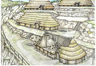 Towards the end of the 3rd millennium BC, the bearers of the Early Bronze Age began the second phase of continuous settlement of the Carevi Kuli site. Research on the southeastern slope showed that the Bronze Age settlement emerged immediately above the strata from the Chalcolithic era. Such settlements are known as hillfort type, i.e. settlements positioned on high and inaccessible hills that dominate the surroundings. The research revealed two phases of living in the settlement from the Early Bronze Age. The buildings were placed on terraces cut into the slope.[4]