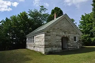 The school's construction date is uncertain. The town has documentation that a school was standing at this site in 1821, but it is not known if this was that building, or if it was built in 1829, the date given on the gable stone. Its massing and arrangement of windows are fairly typical for Vermont's 19th century district schools, although the use of stone is somewhat unusual, as is the entry vestibule, a clear adaptation to Vermont's sometimes harsh winter conditions.[2]