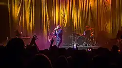 In late January 2014, Anderson announced that Suede were working on a new album and estimated that it would be released in 2015, as the band were still in the writing stage for the album.[99] On 7 September 2015, the band announced that their new album, Night Thoughts, would be released on 22 January 2016, alongside a feature film directed by photographer Roger Sargent.[100] On 24 September, the first single from the album, "Outsiders," was released. The band performed the album in full on 13 and 14 November at the London Roundhouse.[100] The album was released as a standalone CD, as a double pack with the movie on DVD, and as a limited numbered edition featuring the CD, DVD, and a book. Anderson noted that, unlike previous albums, for the first time the band had the freedom to do their own thing. Without the pressure to aim for the mainstream, the band deliberately avoided writing any radio hits.[101] Night Thoughts was well received by both fans and critics, receiving widespread press coverage upon its release. Following the success of Bloodsports, Night Thoughts charted at No. 6 in the UK. A series of concert dates in the UK and Europe followed to support the album. The first half of each show featured the band playing the album tracks in sequence, with the movie projected onto a gauze screen behind them. The second half included a mix of back-catalogue material, including several b-sides and obscure songs. The band also held a number of in-store acoustic appearances in HMV stores to promote the release, including Q&A sessions and movie screenings.