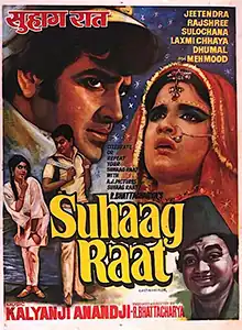 Suhaag Raat (transl. Wedding Night) is a 1968 Hindi-language drama film, produced and directed by R. Bhattacharya under the A.J. Pictures banner. It stars Jeetendra and Rajshree, with music composed by Kalyanji Anandji.[2][3][4][5][6]