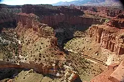 It is a 6.25 mile hike one way and has been categorized by the state of Utah as an easy hiking trail.[2] The canyon contains waterfalls, pools, overhangs and red sandstone, and a shallow stream that runs through it year-round. The route begins from near the Chimney Rock trailhead and ends at the Visitor Center.[3] The rocks at Sulphur Creek are some of the oldest exposed rocks in Capitol Reef.[4]