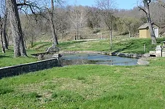 On the north side of the mineral springs courtyard is a lily pond fed by the mineral springs and contained within a wall of stacked limestone. It is decorated with a limestone arch and footbridge decorated with the letters "SS" (Sulphur Springs). Dr. Alvin R. Bills, who built the original dam, also built this wall at the same time.