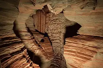 The Gruta da Lapinha is a cave within a limestone massif formed around 600 million years ago in the bed of the sea that once covered the whole region. The great hall created where the limestone has dissolved is 511 metres (1,677 ft) long and 40 metres (130 ft) deep. It contains beautiful speleothems, which are illuminated by light-emitting diodes (LEDs) to avoid generating too much heat.[2]