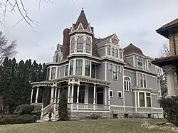 After the Italianate style, the next style to become widespread on Summit Avenue was the Queen Anne style.[13] Its name is misleading as although named “Queen Anne” it bore no real resemblance to early 18th-century British architecture. Instead, this style was fantastical in appearance featuring columns and pediments, peaked, high-pitched roofs, and profuse decorative elements such as dormer windows, gables, bays, porches, balconies, and turrets.[15] In addition, this style almost always includes a wrap-around porch and either a round or polygonal corner tower coming out of the spire-like roof.[15] Such houses were constructed using materials such as stone, slate, brick, wood, shingles, and half-timbering. Summit Avenue’s lost 1882 Barnum House once exhibited a transition from the aforementioned Italianate style to that of the newer Queen Anne. It featured characteristics of both styles such as typically Italianate porch detailing, windows and bracketing while also having a roof, balconies, and turrets that adhere more to the new style.[13] Summit Avenue contains many houses built in the purely Queen Anne style such as the castle-like red brick Driscoll House with its conical turret and high-pitched roof spotted with many dormers and chimneys.[13] The beautifully painted wooden “fairytale” residence at 513 Summit was also constructed in this style and features a large porch and a fanciful turret.[13] One of the best-preserved Queen Anne Style houses on the Avenue is the Shipman-Greve House at 445 Summit. This unique limestone house exhibits half-timbering and decorative Japanese-inspired latticework on the porch.[13] A variant of the Queen Anne style commonly known as the “Shingle Style” can be seen in Summit’s 1884 Noyes House. This Shingle Style was similar to the Queen Anne but was constructed with wood shingling on every surface, giving these buildings an irregular texture.
