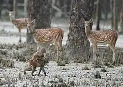There are more than forty species of mammal present in this and the adjoining Sundarbans West Wildlife Sanctuary and Sundarbans South Wildlife Sanctuary. The rhesus macaque (Macaca mulatta) is plentiful and is the only primate in the area. Bengal tigers are also present; they have a reputation as being man-eaters, but their chief prey is the spotted deer (Axis axis) and the wild boar (Sus scrofa).[1] There are three species of wild cat, the leopard cat (Prionailurus bengalensis), the fishing cat (Prionailurus viverrinus) and the jungle cat (Felis chaus). Also present are three species of otter, one of which, the smooth-coated otter (Lutrogale perspicillata), has been domesticated by local fishermen. The South Asian river dolphin (Platanista gangetica) inhabits some of the larger water channels.[1]