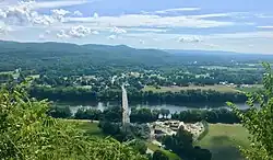 According to the United States Census Bureau, the town has a total area of 14.7 square miles (38.2 km2), of which 14.2 square miles (36.9 km2) is land and 0.50 square miles (1.3 km2), or 3.53%, is water.[4] Sunderland is located in the Pioneer Valley on the east bank of the Connecticut River, which drains the town. Mount Toby, a prominent conglomerate mountain with a firetower lookout, stands at the east border of the town and is traversed by the 47-mile (76 km) Robert Frost Trail. The mountain, surrounded by Mount Toby State Forest, is known for its waterfalls, scenic vista, and biologically diverse ecosystem. Sunderland is home to the Buttonball Tree, an American sycamore famous for its size and age.
