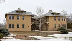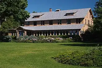 The Main Lodge (1915) is a two-story frame gable roofed building. Simple Midwest bungalow detailing includes craftsman-style brackets in the gables and exposed rafter ends. Fenestration includes both single and paired rectangular double-hung windows. The building is sheathed in clapboard. The full front porch, originally screened, has been enclosed and a porte-cochère added over the front entrance; this was deemed sympathetic to the original design in the NRHP nomination. Other changes have included the addition of a one-story sun room to the north, shed dormers on the roof, and additions to the rear of the buildings.[3]