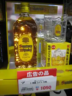 A Suntory Kakubin ("angled bottle") Whisky bottle and glass display at a Yamaya Liquor store in Iizaka, Japan