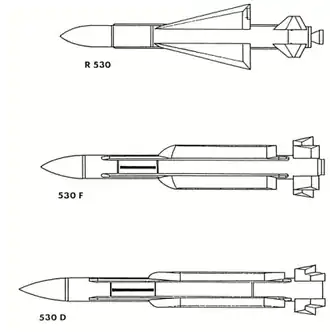 ![]() Its predecessor, the R530, the Super 530F, and the Super 530D missiles | |