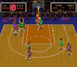 The game features 28 fictional teams; 27 of them are based on real cities while the 28th is an all-star team. There is an exhibition and a playoffs mode. Earvin "Magic" Johnson gives the pre-game commentary about the strengths of the teams, while broadcaster Chick Hearn gives the play-by-play during the game.[3]
