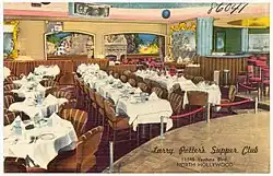 The first supper club in the United States was established in Beverly Hills, California, by Milwaukee, Wisconsin, native Lawrence Frank.[4] Supper clubs became popular during the 1930s and 1940s, although some establishments that later became supper clubs had previously gained notoriety as prohibition roadhouses.[5]