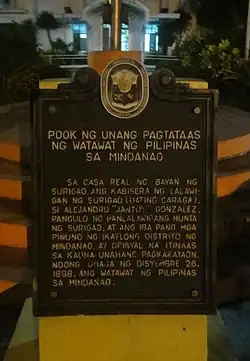 - Controversy about the location of the First Philippine Flag Raising in Mindanao. The Philippines' National Historical Institute carries the mandate to decide on historical matters and to erect national markers. In a roundtable held in January 2000, the historians decided that the raising of the flag on December 26, 1898, by Alejandro Gonzalez in Surigao was duly sanctioned by Emilio Aguinaldo's government. The installation of the NHI marker in Surigao City followed suit.[1]