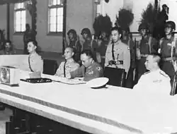 The official surrender ceremony of World War II in China was held in the auditorium of the Central Army Military Academy in Nanjing, Republic of China at 9:00 on September 9, 1945.[1] During the 15-minute ceremony, General Yasuji Okamura, Commander-in-Chief of the Chinese Expeditionary Force of the Imperial Japanese Army, signed the surrender letter which was written in Japanese and Chinese.[2] The unconditional surrender was accepted by Kuomintang General He Yingqin, the representative of Allies of World War II and the commander-in-chief of the Republic of China National Revolutionary Army.[3]