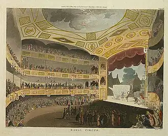The Royal Circus was opened on 4 November 1782 by the composer and songwriter, Charles Dibdin (who coined the term "circus" for that usage),[1] aided by Charles Hughes, a well-known equestrian performer. The entertainments were at first performed by children with the goal of its being a nursery for young actors. Delphini, a celebrated buffo, became manager in 1788 and produced a spectacle including a real stag-hunt. Other animal acts followed, including the popular dog act Gelert and Victor, lecture pieces, pantomimes and local spectacles. The popular comedian John Palmer then managed the theatre until 1789,[2] when he was committed to Horsemonger Lane Gaol as "a rogue and a vagabond".[3]