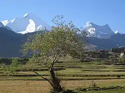 The lower part of the valley, at altitudes below 3,000 metres (9,843 ft), is one of the most agriculturally productive parts of Ladakh with two crops a year being harvested, watered by the run-off from the very heavy winter snowfalls,[32] and even plantations of willow and poplar trees making it a relatively lush and very attractive area, but around Rangdum the landscapes are stark, flat moorlands ringed by arid crags.[33] The spiky white topped mountain peaks of the Nun-Kun massif, topping 7000 m, are visible from several places in the valley.