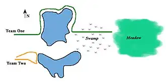 In Episode 7, "Deep Woods, Part 2", both teams started out at relatively the same spot (see map, right). Each team was told to head east, pass through the swamp, and arrive in the meadow. Neither team was told that a lake lay in their path. The shortest course for each team would be to pass between the lakes. Team One navigated east correctly, but then took the long way (north) around the lake. Their five-hour hike turned into a 10-hour trek. Team One arrived at the meadow, however. Team Two's navigation was errant, and the team traveled east for only a short time before drifting east-southeast. When Team Two reached the lake, they became lost and turned north when they thought they was going south. Team Two then mistakenly doubled back to its starting point and never made it to the meadow.[16]