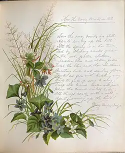 Susie Barstow Skelding's color plate of violets and white clover framing a handwritten poem by Mary Mapes Dodge; from her 1883 book Flowers from Hill and Dale.