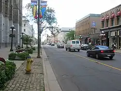 At the Alexandra Bridge approach, Sussex Drive becomes a northbound one-way arterial road paired with Mackenzie Avenue, which serves southbound traffic. St. Patrick Street and Murray Street, also a one-way pair, provide access to and from the bridge. The four roads combined encircle the Peacekeeping Monument, while Major's Hill Park lies to the southwest of this junction. Entering the ByTown Market along its western edge, Sussex Drive features wall-to-wall storefronts with apartments above them on the east side and the Embassy of the United States on the west side. The Former Geological Survey of Canada Building and Connaught Building sandwich the road at George Street. Sussex Street ends at Rideau Street, where it and Mackenzie Avenue connect with Colonel By Drive south along the eastern bank of the Rideau Canal. The Rideau Centre stands on the southeast corner of the intersection, while the former Union Station which was repurposed into the Senate of Canada Building is on the southwest corner.[1][6] The Daly Building once stood between Sussex and Mackenzie on the north side of Rideau Street, but was demolished in the early 1990s and replaced by a residential condominium in 2005.[13]