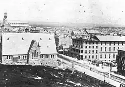 On the eve of Confederation, Rideau Hall, which was built by McKay, was leased to the government of Canada West in 1865 before being bought outright in 1867.[51] This, along with John A. Macdonald's home Earnscliffe, would establish Sussex Street as the heart of the new capital of Canada.[note 1][6][25] By this time, several of the non-governmental institutions were established along the street, including Ottawa General Hospital (now Élisabeth Bruyère Hospital),[12] Bytown College (now La Salle Academy),[29] Notre-Dame Cathedral,[31] the Former Geological Survey of Canada Building,[38] the Revere Hotel,[36] and what is now 24 Sussex Drive.[16] These buildings, as well as houses, shops and hotels, were built following the passage of the Vesting Act in 1843, which subdivided the land in Lower Town, as well as the arrival of the railway in 1854.[43][52] The ByWard Market was subsequently established over the next half century.[43] During the early 1900s, several notable government institutions were built along Sussex Street, including the Dominion Archives in 1906 (later the Canadian War Museum, now the Global Centre for Pluralism), the Royal Canadian Mint in 1908,[53] and the Connaught Building in 1915.[39] The Daly Building, which opened as a department store in 1905, was purchased by the government in 1921; it was demolished in 1991 after standing vacant for several years.[54]