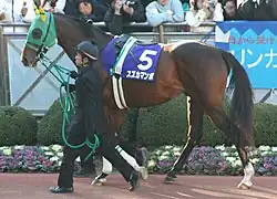 In 2005 as a mature 4 year old, Suzuka Mambo ran five times, four of them Grade I races, again with widely varying results, winning once, and suffering a career-ending injury. His first race was the Osaka-Hamburg Cup on April 9, 2005 at 2,500 metres (8,200 ft), where he finished third. As a result, Suzuka Mambo was only ranked 13th for his next start, the Grade I Spring Tenno Sho, held at Kyoto and contested at 3,200 metres (10,500 ft).[4] However, in that race, he got a good trip on the course and won.[9] He did not race again until the Autumn Tenno Sho on October 30, where he finished last of 18 horses. He tried again in the GI Japan Cup on November 27, where he finished 9th of 18 horses. His next attempt was the December 25 Arima Kinen where he finished 10th out of 16. In 2006, Suzuka Mambo, at 5 years old, began the season on April 2 at the GII Sankei Osaka Hai. In this race, he finished third.[4] After the race Suzuka Mambo developed a serious ligament tear in his left hind leg that ended his racing career.[10]