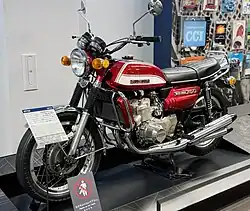 The Suzuki GT750 is a water-cooled three-cylinder two-stroke motorcycle made by Suzuki from 1971 to 1977. It is the first Japanese motorcycle with a liquid-cooled engine.[3] The Society of Automotive Engineers of Japan (in Japanese) includes the 1971 Suzuki GT750 as one of their 240 Landmarks of Japanese Automotive Technology.[4]
