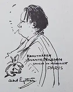When Svante Nilsson was thirteen years old he began to study medal engraving for the Swedish engraver Adolf Lindberg (1839–1916)[1][2] in Stockholm. Adolf Lindberg was a prestigious and reputable medal engraver in Sweden during the 1800s. After ten years of teaching in Stockholm Svante Nilsson mastered the art of producing the medal stamps. Then he was awarded the scholarship of Kommerskollegium[3] in 1893, that he used to further education in Paris and Rome. Svante Nilsson remained in Paris. He collaborated with the Swedish medal engraver Sven Kulle (1860–1945),[4][5] who resided in Paris in France. Sven Kulle had established a studio in Paris in 1891 where, among others, Svante Nilsson was employed. At the same time Nilsson also studied at École des Arts Décoratifs, a public university of art and design in Paris, the school is one of the most prestigious French grande école, and at Académie Colarossi, another art school in Paris. Svante Nilsson participated in several exhibitions during his years in Paris and he played a significant role in the Swedish art colony. His home became a gathering place for the Swedish art students. He stayed in Paris from 1893 to 1914. He returned to Sweden when the first world war broke out in 1914.