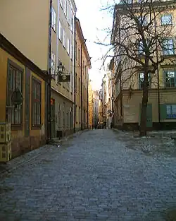 Svartmangatan (Swedish: (literally)) "Black Man Street") is a street in Gamla stan, the old town of Stockholm, Sweden. Stretching south-east from the central square Stortorget to Södra Benickebrinken and Norra Benickebrinken leading to the eastern main street Österlånggatan, it is intercepted by Kindstugatan, Tyska Skolgränd, Tyska Brunnsplan, Själagårdsgatan, Tyska Stallplan, and Baggensgatan, while forming a parallel street to Skomakargatan and Prästgatan. The name refers to the Blackfriar monastery once located at the southern end of the street.