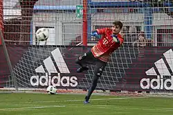 He was able to feature regularly for Bayern Munich during the 2017–18 season, due to a long-term injury to first-choice goalkeeper Manuel Neuer.[10] Ulreich started the 2017–18 season by playing in the German Super Cup.[11] Ulreich played a key role in guiding Bayern Munich to a record sixth successive German Bundesliga title, which was confirmed in a 1–4 win away at FC Augsburg on 7 April 2018.[12] However, Bayern Munich were eliminated from 2017–18 Champions League partly due to a goalkeeping error by Ulreich against Real Madrid in semi-finals.[13][14][15] Bayern lost 4–3 on aggregate.[13] In total, he made 47 appearances in the 2017–18 season.[16]