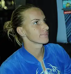 Kuznetsova was the defending champion at the San Diego Open but withdrew due to a groin strain.[125] She recovered quickly from the injury and entered the Rogers Cup, but lost to Simona Halep in the first round.[126] As 14th-seed, she made it to the third round of the Western & Southern Open and was beaten by eventual champion Maria Sharapova.[127] Kuznetsova reached the fourth round of the US Open in which she lost to top-seeded Wozniacki.[128]