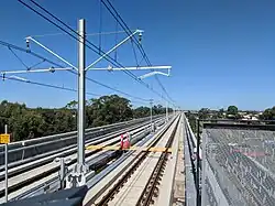 The entire line is electrified via overhead catenary at 1,500 V DC to power the metro trains. The viaduct and ground level section between Tallawong and Bella Vista uses standard overhead wires to supply power. For the underground section between Bella Vista and Epping, a rigid overhead conductor system is used instead of wires. For the rest of the line (formerly part of the Epping to Chatswood rail link [ECRL]), the existing sagged catenary overhead wires were retained, with an additional copper cable added in some sections due to the increased current draw of the new rolling stock.