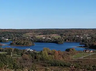 Sydney River rises in Blacketts Lake and runs 12.5 km (7.8 mi) to its mouth, between the Westmount shore near Amelia Point and Battery Point on the Sydney shore,[1] at the South Arm of Sydney Harbour, draining a watershed of 140 km2 [5]: 6 south of the crest of the Coxheath Hills. The river is an estuary for the last 7 km (4.3 mi) below the "Sysco Dam" in the community of Sydney River. The dam was constructed in 1902, converting the stretch of river immediately above the dam from a tidal estuary to a freshwater reservoir lake.[5]: 6 Its watershed contains more than 2000 homes.[2]