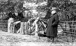 He purchased and paid for the erection in Friary Park in May 1911[8][11] of a statue of Queen Victoria as Peace that was grade II listed by Historic England in 1983.[6] It bears a dedication dated 7 May 1910 to the memory of Edward VII who died on 6 May 1910.[6] It stands on 200 tons of rock from Devon, shaped in the form of a tor.[8] The statue originally had Victoria holding a dove but at some time that was changed to a spear.[11] The statue was restored by Barnet Council in 2022 and the dove reinstated.[11]