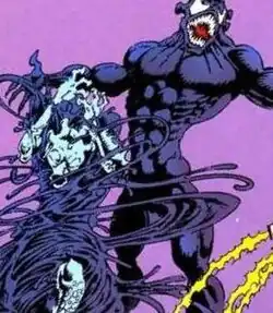 During the Kree-Skrull War, the Kree wanted to replicate the Skrull's shapeshifting abilities; they acquired a newborn symbiote which had been outcast from its species on the planet where Knull had created them.[13] They recruited the Kree Tel-Kar to be bonded to the young symbiote, and modified both Tel-Kar and the symbiote so that he could have full control over it. He infiltrated the Skrulls using the symbiote's shapeshifting ability, but was discovered. He deleted the symbiote's memories and separated himself from it.[14] The symbiote then reunited with the parasitic symbiotes, retaining little memory of its first host. When the corrupted symbiotes found out that this symbiote wanted to commit to its host rather than exploit it as they tended to do, they decided that it was insane and trapped it in a canister to be condemned to die on a planet that would later become part of Beyonder's Battleworld. There, it would be encountered by Spider-Man in the 1984 miniseries Secret Wars. In that story, which saw the heroes of Earth transported to this planet to battle their archenemies,[15] Spider-Man sought to repair or replace his tattered costume, which had been damaged in battle, and was directed by Thor and Hulk to a device inside the alien compound that they had come to use as headquarters. Mistaking the device in which the symbiote was imprisoned for the device Thor and Hulk mentioned, Spider-Man activated it, freeing the symbiote, which appeared before him as a black sphere that enveloped his body and took on the form of a black version of his costume that could respond to his mental commands. Spider-Man assumed that the device produced clothing designed to do this.[16] He did not know that Deadpool had already briefly bonded with the symbiote and had corrupted it with his unstable personality.[17] Spider-Man returned to Earth with the symbiote, where, after discovering that it was an alien lifeform that wanted to bond with him, he managed to separate himself from it by using sound waves to hurt the creature, which took refuge in a church's bell tower. It later bonded with Eddie Brock, who went to the church, despondent and vengeful after his journalism career was destroyed because he incorrectly identified the serial killer known as Sin-Eater as a man who later turned out to be a compulsive confessor; he blamed this turn of events on Spider-Man. Having bonded with the symbiote, the two became the being known as Venom.[18] During this time, it spawned seven offspring and a clone; its first child later had three of its own, producing the symbiotes Carnage, Scream, Lasher, Phage, Agony, and Riot.