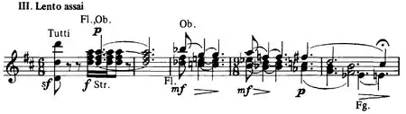 The work is fully representative of the composer's later style with its curious, shifting harmonies, the almost Prokofiev-like grotesquerie of the outer movements and the focus on individual instrumental tone colors throughout (highlighted by his use of an alto saxophone in the opening dance).[2] The opening three-note motif, introduced quietly but soon reinforced by heavily staccato chords and responsible for much of the movement's rhythmic vitality, is reminiscent of the Queen of Shemakha's theme in Rimsky-Korsakov's opera The Golden Cockerel,[5] the only music by another composer that he had taken out of Russia with him in 1917.