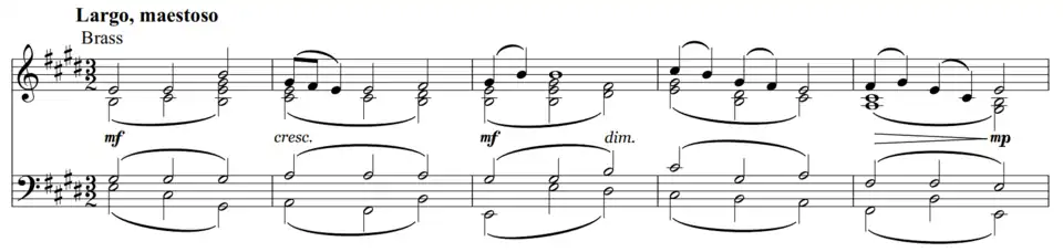 The second movement opens with a hymn-like theme played by a brass choir. The theme is composed in the verse-refrain form and features interjections by the flutes and clarinets. A contrasting section in C♯ minor marked Poco più mosso functions as an interlude between statements of the hymn theme.[10] After a long developmental section, the hymn theme returns again, this time decorated with a clarinet obbligato and cathedral chimes. The movement comes to a gentle close on an E major chord played by the strings.