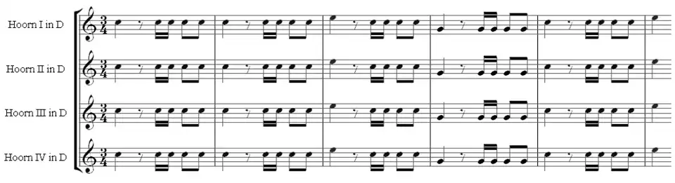 - ^ The horn is a transposing instrument; in this movement the horn players read in the key of C but their instruments sound in D.