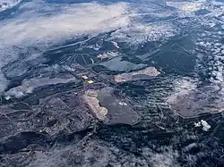 By 2012 Syncrude Canada Ltd had oilsands mining operations on three lease areas (Mildred Lake, Aurora North and Aurora South), all about 40 km north of Fort McMurray.[6] There are many tailings dams on those leases. The lease that has the greatest number of tailings dams, and the largest tailings dams, is the Mildred Lake lease. According to Syncrude's 2010 Baseline Report submitted to the Energy Resources Conservation Board (since replaced by the Alberta Energy Regulator (AER), the Mildred Lake and Aurora North leases together contain: the Mildred Lake Settling Basin (MLSB), Southwest Sand Storage (SWSS), West In-Pit (WIP), East In-Pit (EIP), Southwest In-Pit (SWIP), Aurora Settling Basin (ASB) and Aurora East Pit Northeast (AEPN-E). Those referred to as "in pit" have only small containing embankments.[7] In Aurora South lease the main tailings dam will be the External Tailings Area (ETA).[8]