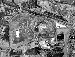 1994 USGS aerial photo showing the former site of the airfield. A short segment of a runway turnaround area is visible in the middle left as well as hangars upper left.