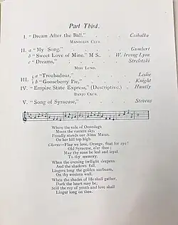 Junius Woods Stevens' composition "The Vale of Onondaga," created in 1893, gained widespread popularity and became a general favorite. It first premiered in a March 15, 1893, performance by the University Glee and Banjo Club at the Wieting Opera House.[1][4][5] The program for the event lists it under the original title of "Song of Syracuse",[6] but it was also occasionally called "Flag We Love".[4][7] While the original handwritten copy of the song includes three stanzas and a chorus,[8] SU's athletics website only lists the verse and the chorus.[9][a]