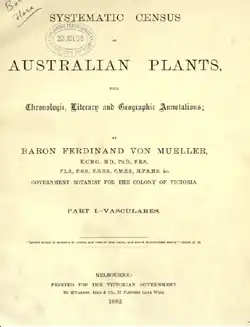 The Systematic census of Australian plants, with chronologic, literary and geographic annotations, more commonly known as the Systematic Census of Australian Plants, also known by its standard botanic abbreviation Syst. Census Austral. Pl.,[1] is a survey of the vascular flora of Australia prepared by Government botanist for the state of Victoria Ferdinand von Mueller and published in 1882.
