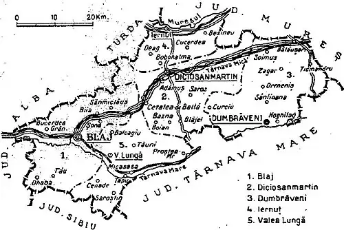 Administratively, Târnava-Mică County was made up of three cities – Diciosânmartin, Ibașfalău (Elisabetopol, Elisabethstadt, Erzsébetváros), and Blaj – and initially four districts (plăși):[1]