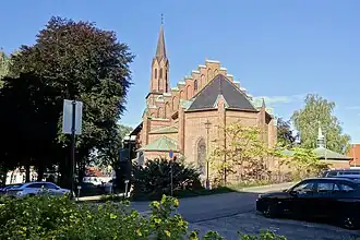 Tønsberg Cathedral (Norwegian: Tønsberg domkirke) is a cathedral that is the episcopal seat of the Diocese of Tunsberg within the Church of Norway. It is located in the centre of the city of Tønsberg in Tønsberg Municipality in Vestfold county, Norway. It is the main church for the "Tønsberg domkirke" parish which is part of the Tønsberg domprosti (deanery) in the Diocese of Tunsberg. The brown brick church was built in a long church design in 18 using plans drawn up by the architect . The church seats about 500 people.[1][2][3]