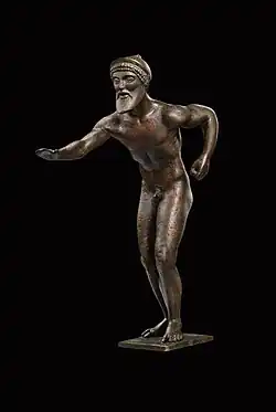 The statuette is made from solid tin bronze and is 16.35 centimetres (6.44 in) tall. It represents a bearded naked man wearing a helmet, in a forward-leaning starting position typical for the Greeks, with the left leg slightly forward and the right arm stretched horizontally forward with an open hand.[1][2] The hole in his left fist clearly indicates that he originally held an object, possibly the grip of a shield.[1] Both feet are on the ground, as if the runner is waiting for the sign to start the race, with his face raised expectantly. His knees are bent and his inclined and well-muscled torso is tensed. The chest is turned towards his left arm, on which he probably wore a round shield.[3] The statuette is missing its separately worked shield.[2] The helmet crest is also mostly missing (a remnant is visible on the 3D model – link below), and originally ran from the front of the helmet down to the middle of the back. The figure is firmly connected to its flat bronze base plate by two round pins on the soles of the feet.[1]