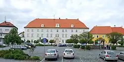 The historic centre is formed by Míru Square with many preserved Renaissance and Gothic-Renaissance houses, and adjacent streets. The main landmarks of the square are the town hall, the church, and the castle. The Renaissance town hall was built in the 17th century and rebuilt after a fire in 1796. The facade of the building in the late Baroque style was lightened by arcades.[7]