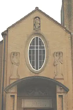 Most of Dale's churches share common features: a tympanum with bas-reliefs over the main door, pantiled roofs, an Italianate pent-roofed chimney for the boiler and in some cases a baldachin over the main altar and a pantiled bell-cot on the west gable. With the exception of St. Francis of Assisi (which is stuccoed) they are built of a modern buff brick that contrasts with traditional building materials in this part of England. The tympanum at St. Alban the Martyr was carved by John Brookes,[17] then Principal of Oxford City Technical College. St. Francis' has also a set of Stations of the Cross carved by Eric Gill.[18]